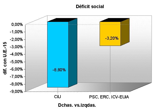 (...) los datos hablan por sí mismos. Cuando el tripartito inició su gobierno en 2003, Cataluña tenía uno de los gastos públicos sociales por habitante más bajos de la UE-15. Y aún cuando continúa siendo demasiado bajo según el nivel económico que Cataluña tiene, ha mejorado considerablemente, habiendodescendido significativamente el déficit del gasto público social por habitante de Cataluña respecto al promedio de la UE-15 (un 3.2%). Durante los últimos años del gobierno conservador (1999-2003) había aumentado un 8.8%.